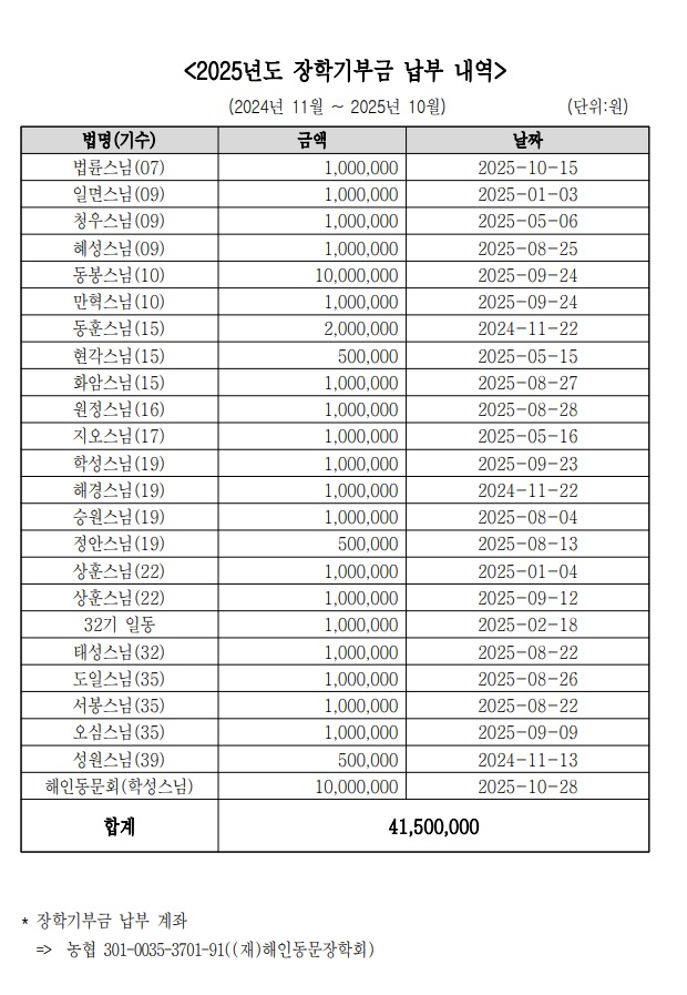 장학기부금 납부 현황 2025년도 장학기부금 납부 현황 페이지 정보 작성자최고관리자 댓글댓글 0건 조회조회 35회 작성일 25-12-11 13:39 본문 . 목록 이전글 2025년 : 총 52명 수혜자 / 총 4,200만 원 지급 25.12.11 다음글2024년 : 총 59명 수혜자 / 총 4,600만 원 지급 25.12.11 댓글목록 댓글목록 등록된 댓글이 없습니다.